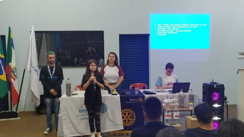 Na noite do dia 03.12 o Rotary Club de Luiziana realizou a primeira reunião para formação do Interact Club em Luiziana com a presença do Interact Club de Campo Mourão. Cerca de 20 jovens participaram desse momento, interessados em participar do programa. O Presidente do Interact de Campo Mourão, João Paulo Tovo e os associados Maria Eduarda, Lucas e Andressa, fizeram uma excelente apresentação explicando como é formado um interact e seus objetivos. Teve inclusive atividade prática onde os jovens, em grupos e orientados por Rotarianos, tiveram que montar e apresentar dois projetos que pudessem ser desenvolvidos em sua comunidade.